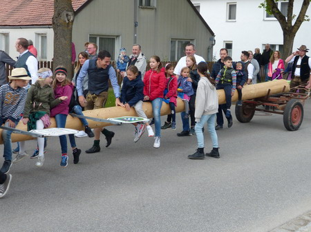 30 m lange Baum vom Hof des Schlossbauern Weinzierl, mit zünftiger Marschmusik
